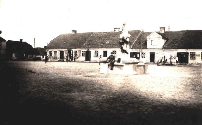 Podpowiedzią może ( choć wcale nie musi ) być wygląd fragmentu zabudowy miasteczka, uwieczniony na fotografii. Postument znajdował się mniej więcej na wysokości dzisiejszej kamienicy pod numerem 21 na Dużym Rynku i domów sąsiadujących na prawo. Gdy moi dziadkowie zamieszkali w niej po wojnie, wyglądała już tak, jak wygląda dzisiaj i taką mam ją na starych zdjęciach w rodzinnym albumie. Nasuwa się przypuszczenie, że tak było również w czasie okupacji.  Tym bardziej, że z innych zdjęć, przedstawiających tę część Dużego Rynku ( ok. 1936 r. ) widać już fragmenty wyższej ściany frontowej budynku. Jednak na najstarszej znanej mi fotografii, tej ze św. Wawrzyńcem, w tym miejscu widać niższy dom ze spadzistym dachem i wykuszem, charakterystyczny dla reszty zabudowy. Kiedy dokonano przebudowy budynku? Nie wiem, ale jedno jest pewne – święty Wawrzyniec stał naprzeciwko na długo przed nią…
