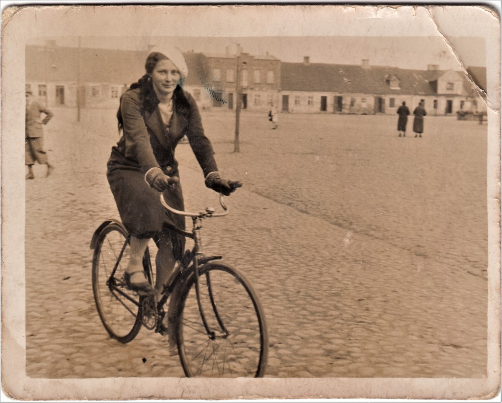 Drugim ze zdjęć jest to, przedstawiające Leokadię Chmielewską, jadącą na rowerze przez rynek. W prawym górnym rogu rysuje się on – pomnik św. Wawrzyńca.