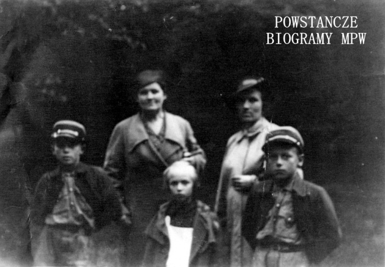 Warszawa, 1938 rok. Marianna Zywert z d. Gilewska z matką i dziećmi. Janusz Konstanty Zywert stoi za zdjęciu pierwszy z prawej.