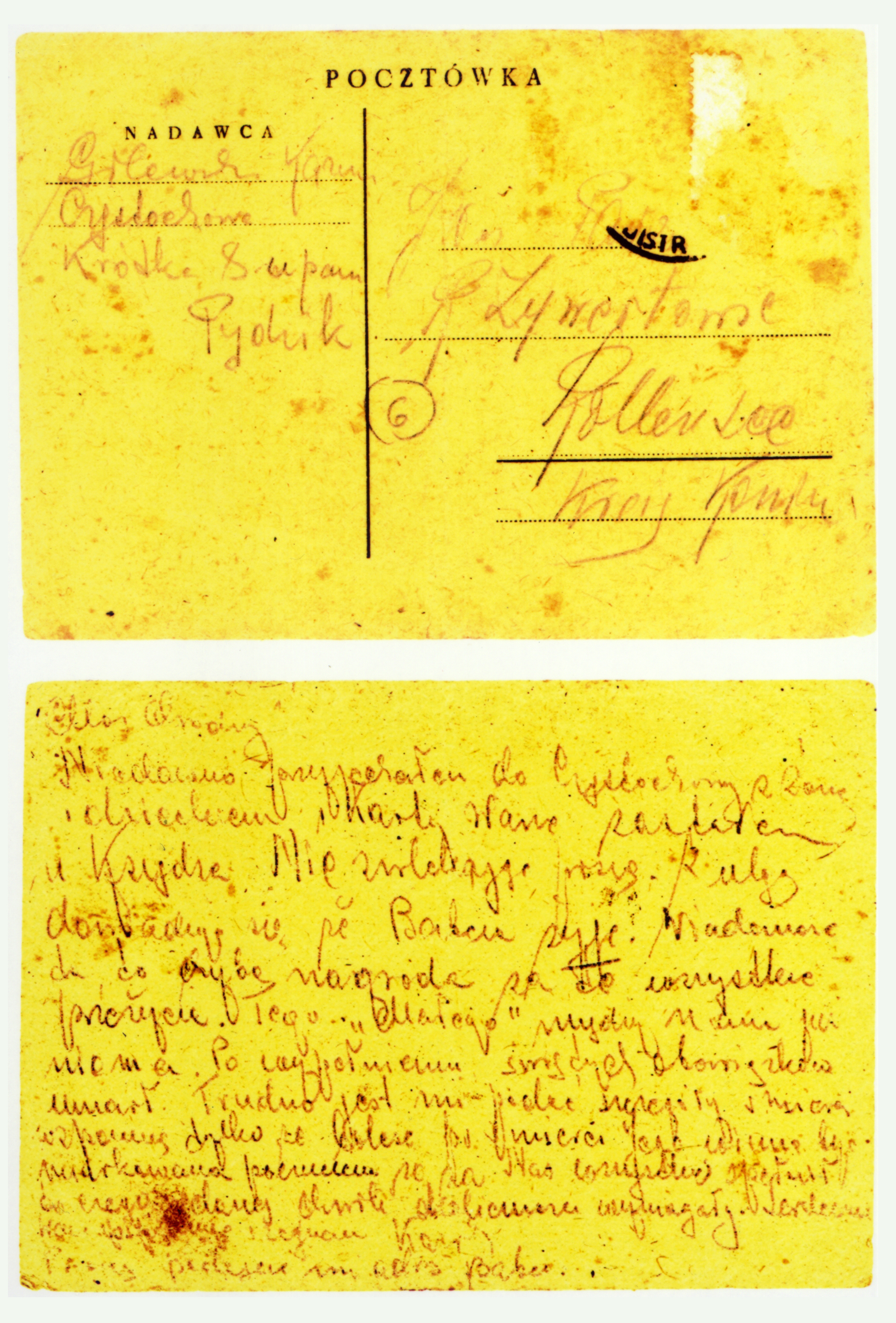 „ Kartka informująca rodziców o śmierci Janusza napisana z Częstochowy przez ks. M. Rzeszewskiego, przyjaciela rodziny. Zdołano odtworzyć następujący zapis dotyczący śp. Janusza. „Janusz spełniwszy (..) obowiązek odszedł.” Kartka niezbyt czytelna – zalana łzami bliskich.”