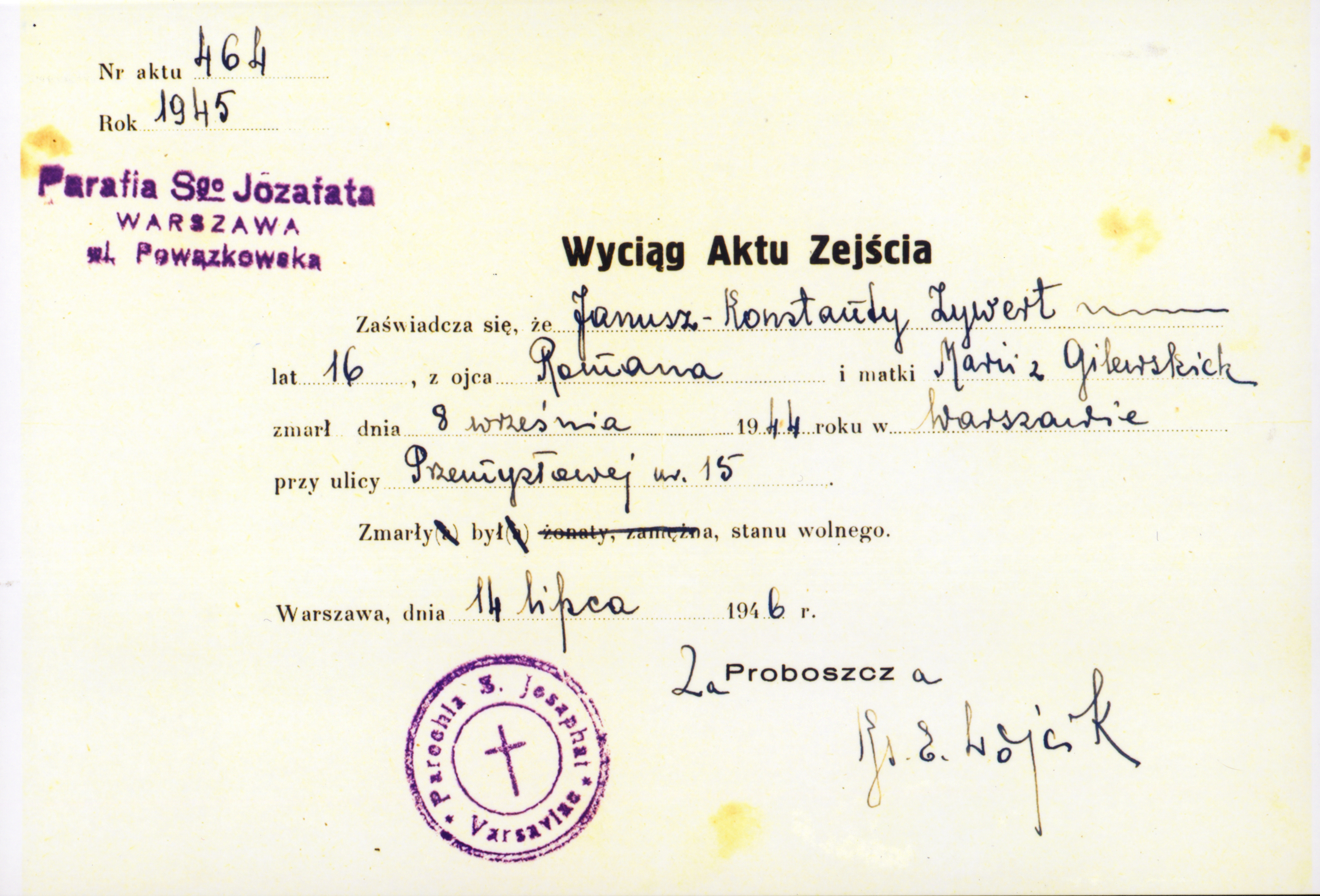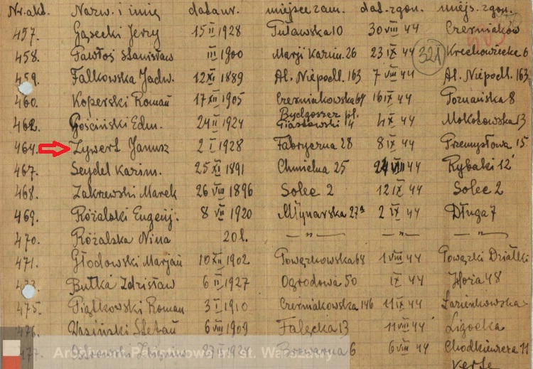Lista osób ekshumowanych po Powstaniu Warszawskim – wśród nich nasz młody powstaniec Janusz Konstanty Zywert
