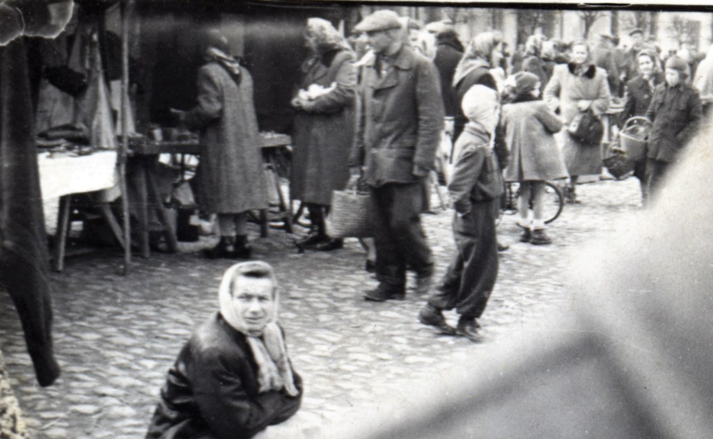 „Furmanki, czyli wozy z prosiakami stały tak bardziej przy parku, a gospodarze stali w tak zwanym szpalerze, jeden przy drugim. Przede wszystkim to były głównie produkty rolnicze. Gołąbki były też – tak, tak, te nieszczęsne gołąbki, co je dziadek tobie na rosołek kupował, jak mała byłaś – kury, kaczki, prosiaczki, gęsi. Z gąsiątkami to stał gospodarz, co pod pachą trzymał dużą gęś, a z tyłu miał te malutkie. Niektórzy kupujący się umawiali z gospodarzami z tych furmanek, żeby słomę kupić, jak kto potrzebował. Nie było ciuchów, może tam ze dwie, trzy budy, ale nie tak, jak dzisiaj. Były za to dewocjonalia, całe stragany, był czapnik, pani Woźniakowa [czapki] miała, może kojarzysz? Były też stoiska z zabawkami dla dzieci, można było kupić sobie na przykład jojo, strasznie wtedy popularne.”