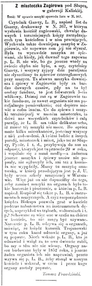 Powyższy artykuł spotkał się z dużym oburzeniem ze strony jednego z parafian, podpisanego imieniem i nazwiskiem – Tomasz Prawdziński. Napisał zatem odpowiedź do redakcji „Gazety Świątecznej” R.8, nr 386 (27 maja 1888 roku). Wynika z niej, iż znał poprzednio piszącego. Tamtego oburza krytyka muzyki w kościele zagórowskim, a tymczasem wszyscy są z niej zadowoleni. Jest co prawda muzyką amatorską, ale pod kierunkiem ucznia szkoły muzycznej w Warszawie. Organy nie były poddawane naprawie i nie są zepsute. Kościół posiada je do 1852 roku. Pan Tomasz pisze też o tym, że to biskup zakazał używania instrumentów dętych w kościołach.