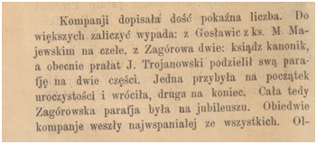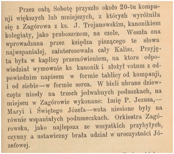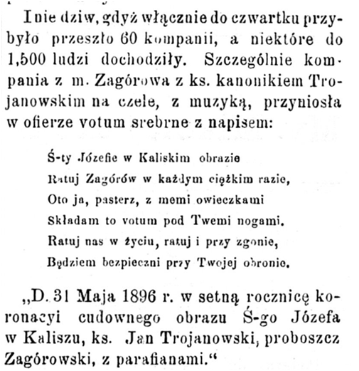 W setną rocznicę koronacji cudownego obrazu św. Józefa w Kolegiacie Kaliskiej odbyła się wielka uroczystość. Wzięli w niej udział parafianie wraz ze swoim proboszczem ks. Janem Trojanowskim. Złożyli wota. Orkiestra zagórowska uznana została za najlepszą z przybyłych. Uroczystość opisuje Michał Ciesielski w książce „Pamiątka pierwszej setnej rocznicy koronacyi cudownego obrazu św. Józefa w kolegiacie kaliskiej” 1897.