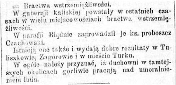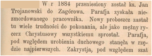 Potwierdzeniem na walkę proboszcza ks. Jana Trojanowskiego z uzależnieniem niektórych parafian od alkoholu może być artykuł zamieszczony w „Kurjerze Warszawskim, R.66, nr 278a (8 października 1886).