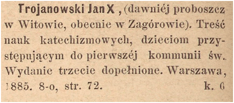 Ksiądz Jan Trojanowski w 1880 roku w Witowie wydał nauki dla dzieci przystępujących do pierwszej komunii pt. „Treść nauk katechizmowych”. W 1885 r. katechizm ponownie został wydrukowany i rozpowszechniony wśród dzieci z parafii Zagórów.