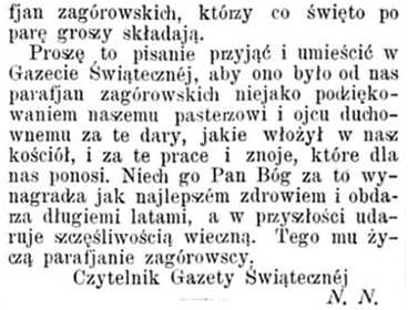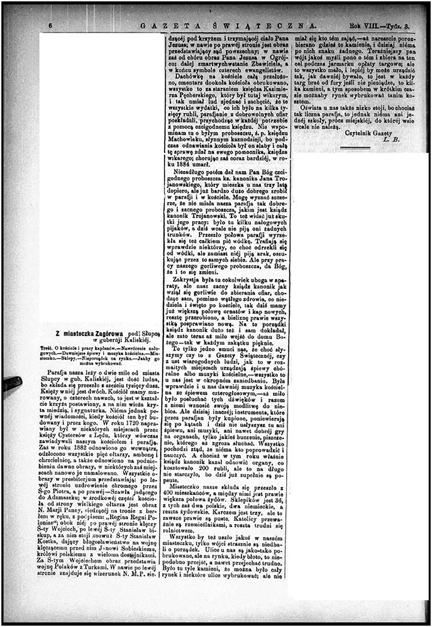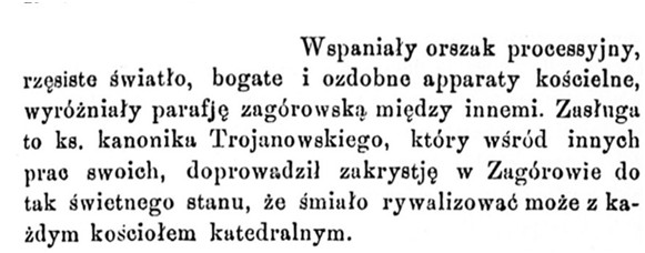 „Gazeta Świąteczna” R.8, nr 367 (15 stycznia 1888 roku) , a w niej list do redakcji pisany bynajmniej nie przez parafianina, a przez czytelnika gazety nie do końca zorientowanego w stanie faktycznym. Dostrzega on co prawda zasługi księży, ale też odważa się na nieuprawnioną krytykę w innych sprawach. W artykule czytamy między innymi o tym, że w roku 1882 odnowiono wnętrze kościoła, pozłacając wszystkie pięć ołtarzy, chrzcielnicę i ambonę, odrestaurowano obrazy na sklepieniu. Dzięki staraniom ks. Kazimierza Pęcherskiego, jeszcze jako wikariusza, przełożono dachówkę na dachu kościoła, obrukowano cmentarz dookoła kościoła. Cześć nakładów na te prace to ofiary parafian. Remontami zajmował się ks. Kazimierz Pęcherski, gdyż ks. Mikołaj Machowiak był już wtedy bardzo słaby. Przypomnijmy, że zmarł w roku 1884. Czytelnik zachwala wielkie zaangażowanie w sprawy kościoła ks. Jana Trojanowskiego, który m.in. wyposażył zakrystię w szaty kościelne. Zatroszczył się o parafian i znacznie zmniejszyła się liczba nałogowo pijących. Potem autor listu do redakcji gazety zaczyna już tylko krytykować. Nie podoba mu się śpiew i muzyka w kościele. Pisze o zepsutych niedługo po naprawie organach, co nie jest prawdą. Wytyka też inne kwestie w Zagórowie, które mu się nie podobają. Krytykuje wójtów za nieporządek w mieście. Wprawdzie twierdzi, że ulice są wybrukowane, ale na rynku przeszkadza mu błoto. Ubolewa nad faktem, że istnieje tylko jedna szkoła miejska. List ów podpisuje tylko inicjałami L.B.