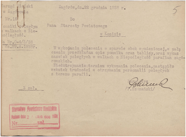Pismo przewodnie Zarządu Miejskiego w Zagórowie, w odniesieniu do tablicy pamiątkowej /AP Poznań OK/