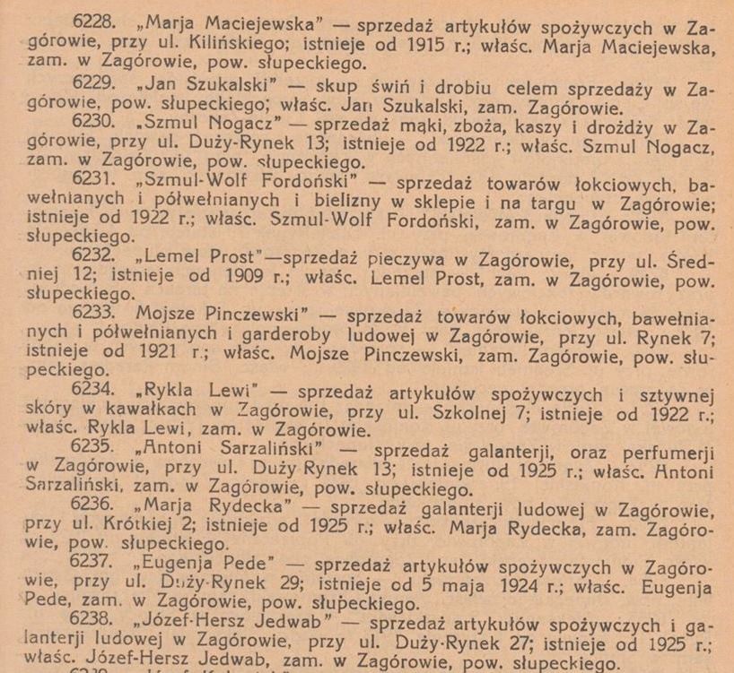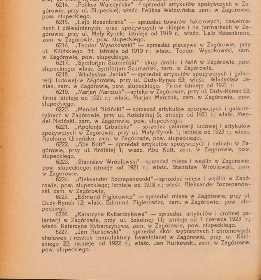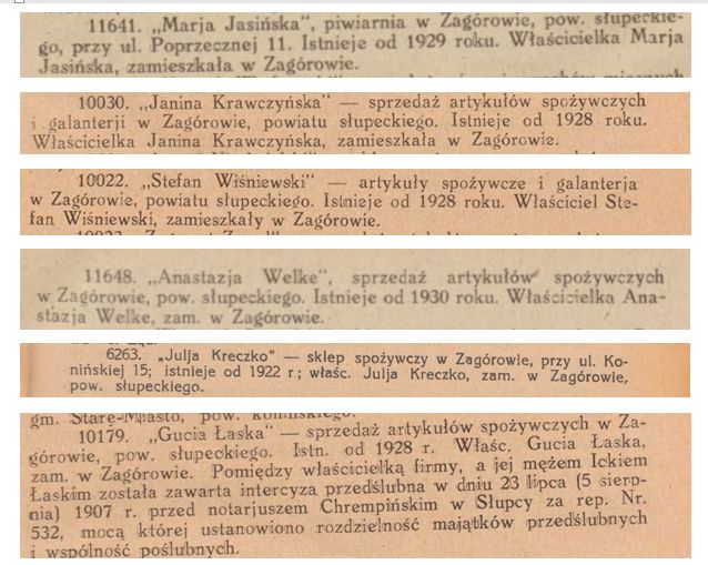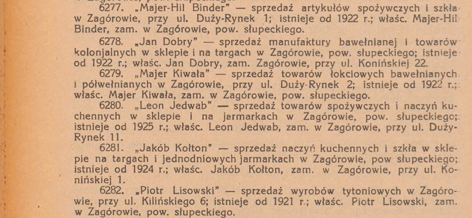 Po I wojnie światowej na dużą skalę rozwija się w Zagórowie przedsiębiorczość, jak zresztą i w innych miejscowościach. Po odzyskaniu niepodległości handel i przemysł praktycznie nie istniały. I wówczas ludzie majętni i przedsiębiorczy zakładają firmy, sklepy, zakłady. Oto niektóre znalezione informacje. Warto wczytać się w poniższe wycinki. Może znajdziemy swojego dziadka lub innego przodka. Być może na Twojej ulicy, tuż obok, był niegdyś sklep? Poszukiwania są tak przyjemne. Starałam się zebrać możliwie jak najwięcej wpisów do rejestru, by Wasza droga do poznawania historii była krótsza niż moja.