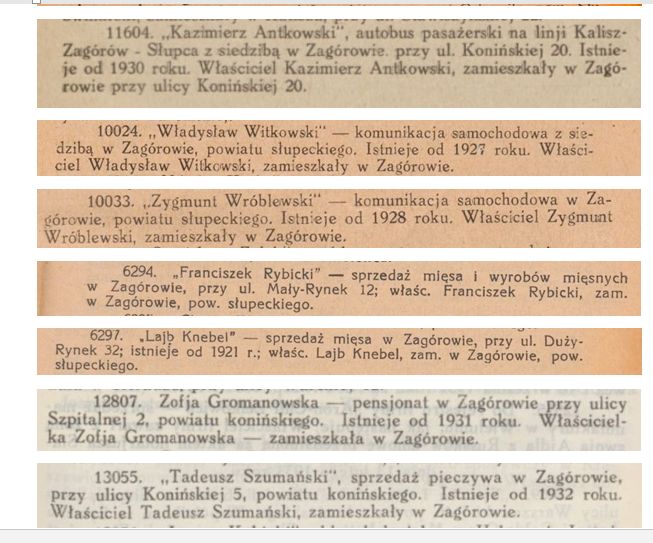 Stara prasa i inne wydania są doskonałym źródłem wiedzy o tym, co i gdzie znajdowało się kiedyś w mieście. Jakie były sklepy, jakie zakłady, na jakiej ulicy, kto był właścicielem. Niekiedy możemy też przeczytać od którego roku dany sklep, czy zakład istniał. Jest to doskonałe źródło również do poszukiwań genealogicznych. Najwięcej takich informacji możemy zaczerpnąć z wydań „Obwieszczenia Publiczne: dodatek do Dziennika Urzędowego Ministerstwa Sprawiedliwości”. Tam bowiem są wykazy firm, które musiały być wpisane do rejestru handlowego. I to jest właśnie źródło zamieszczonych poniżej wycinków.