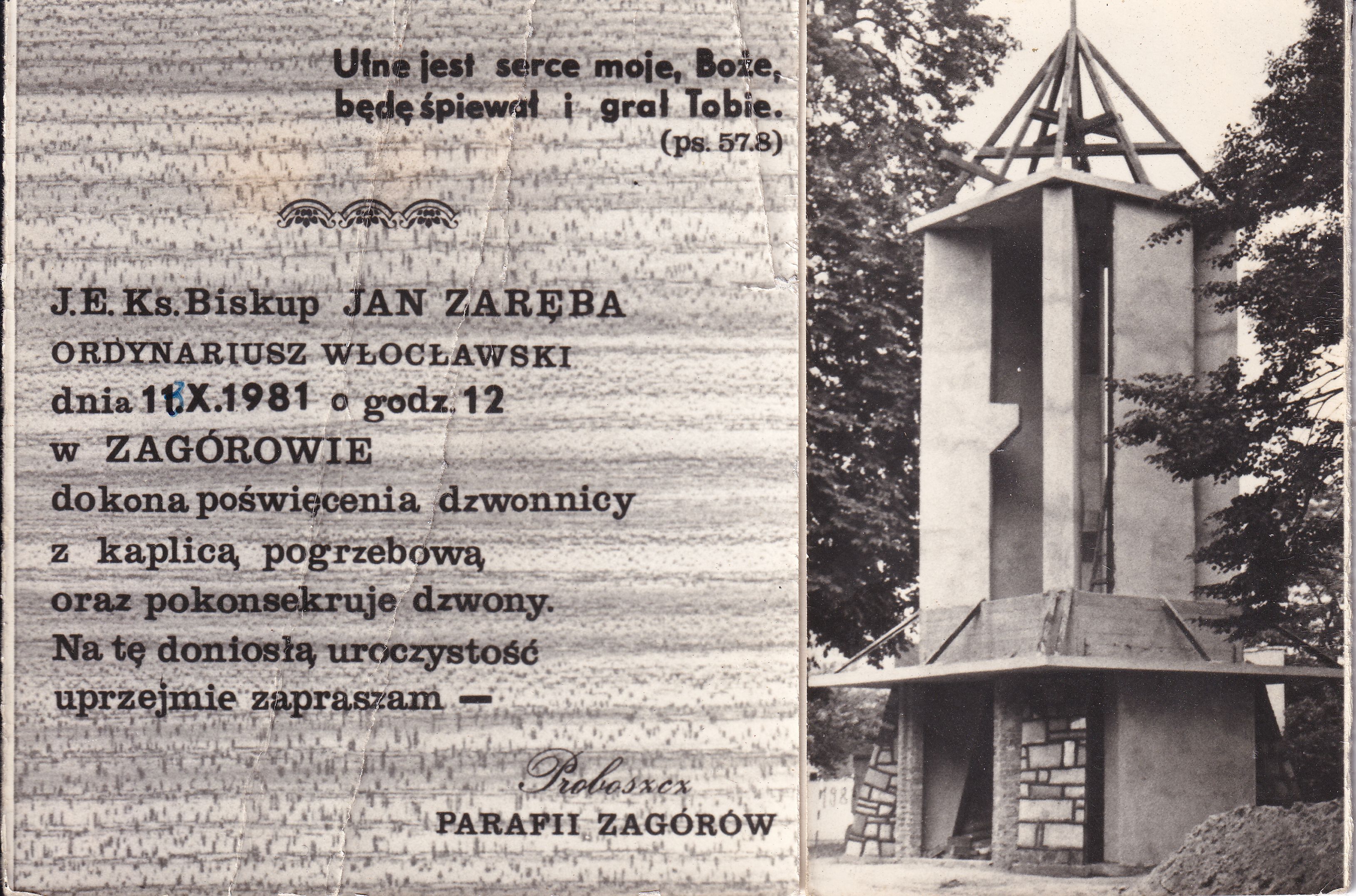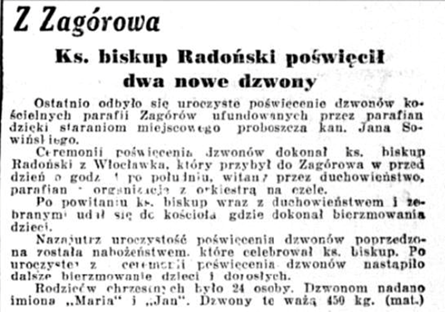 W 1937 roku dzięki staraniom ks. Jana Sowińskiego zagórowski kościół wzbogacił się o dwa nowe dzwony, ufundowane przez parafian i poświęcone przez ks. biskupa Radońskiego. Dzwonom nadano imiona „Jan” i „Maria”.