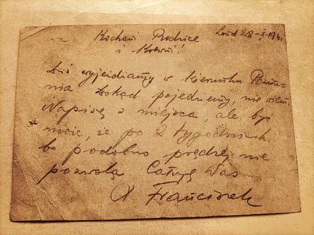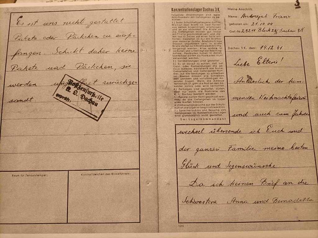 Ale ks. Franciszek nie skarżył się na życie w KL Dachau…nie mógł, a może i nie chciał martwić swoich ukochanych. Z obozu rodzinie przesłał 22 listy, wszystkie w języku niemieckim, jeden z nich był po polsku – ten wysłany jeszcze z Lądu.