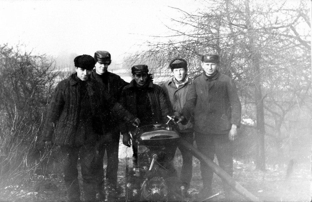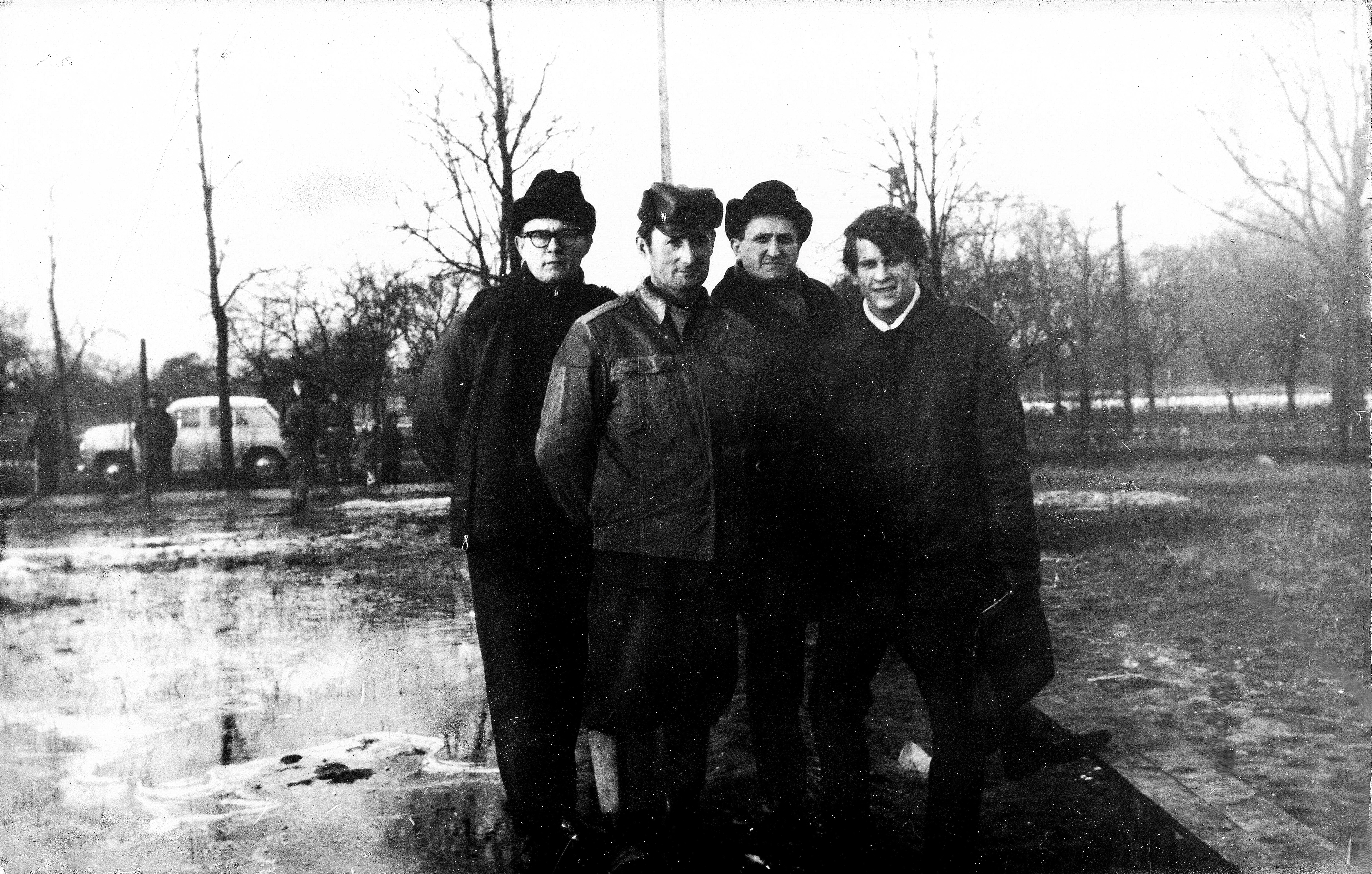 Zaangażowani całym sercem w budowę lodowiska: E. Drop, Wilczyński ( naczelnik OSP Zagórów ), A. Andrzejewski oraz T. Banaś. Fot. z Kroniki Szkoły Podstawowej w Zagórowie