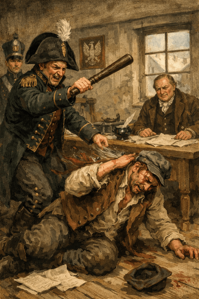 Przesłuchania świadków pomogły dokładniej przyjrzeć się tej dramatycznej scenie. Oto Burmistrz ze swymi ludźmi udaje się do domu Krygowicza, „typa niespokojnego bądź ze słabości zmysłów, bądź z pijaństwa”, rozwścieczony informacją, jakoby krewki Zagórowianin znów często bije swoją żonę. Na pytanie o powody, Krygowicz zaczyna lżyć urzędnika, na co Kowalewski nakazuje żandarmowi Szapniewskiemu porządnie obić delikwenta. Ten się wzbrania, lecz zwierzchnik jest nieugięty.